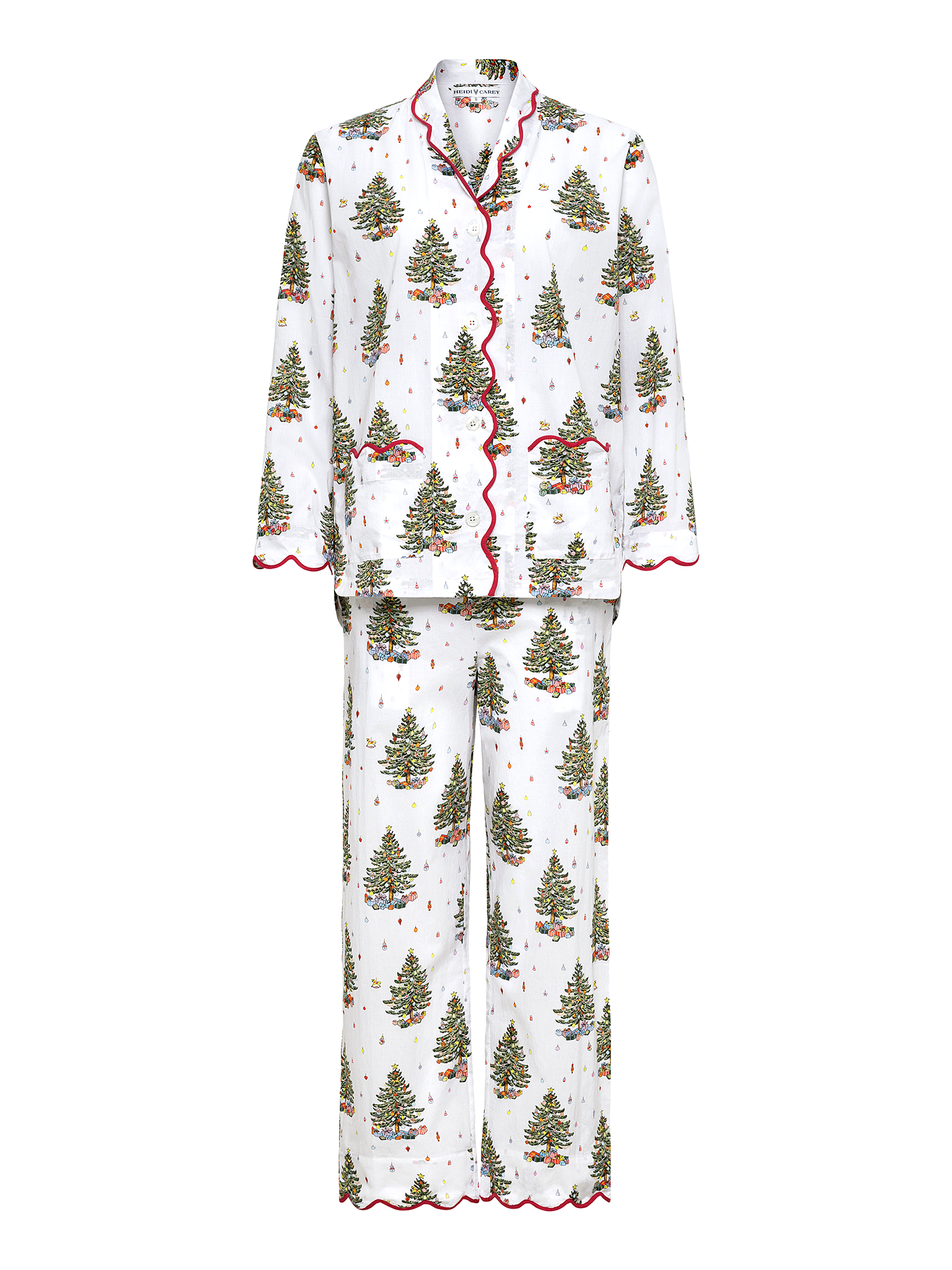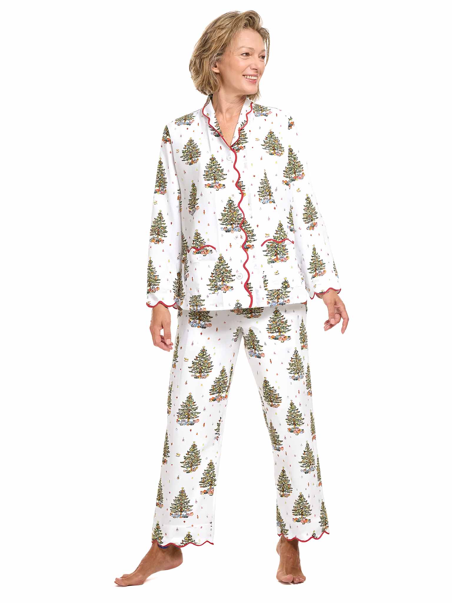 Did you know the average woman spends nearly 26 years of her life in bed? Make every one of those nights count with my flattering 2-piece Christmas Tree Holiday pajama set, designed for the ultimate beauty rest. Handcrafted by skilled artisans, each set features exquisite hand-block printing on 98% Indian cotton and 2% lycra for an added stretch. Crisp and durable, yet light enough for warmer temperatures. Fabric becomes softer after each wash, improving in comfort with age.