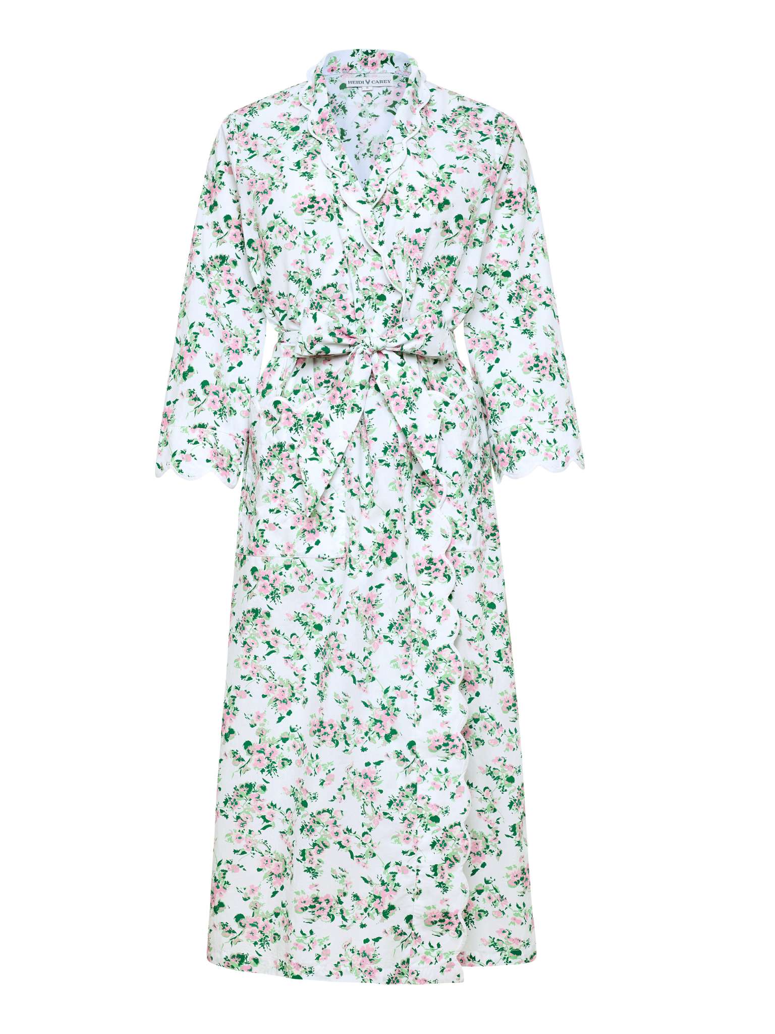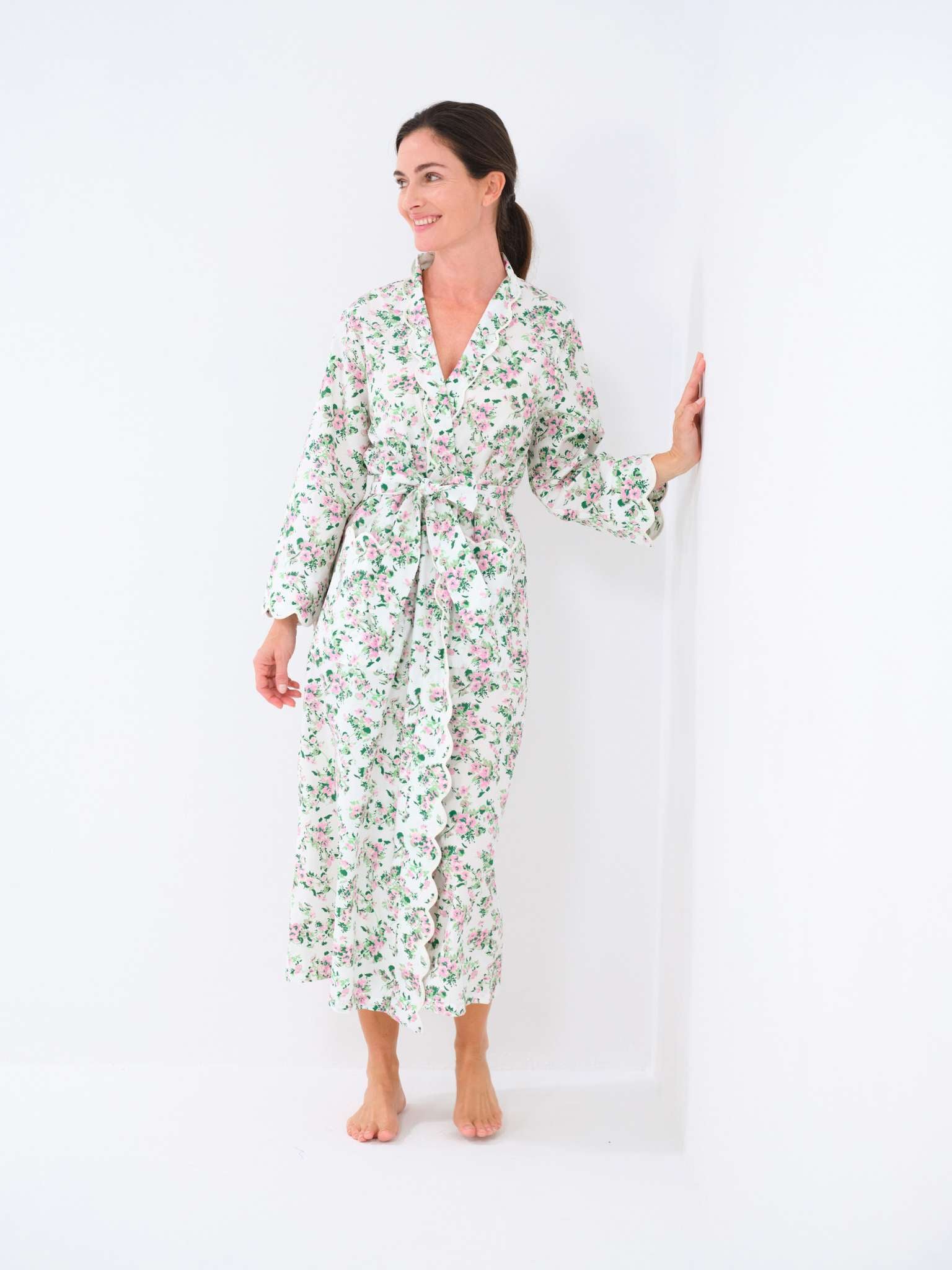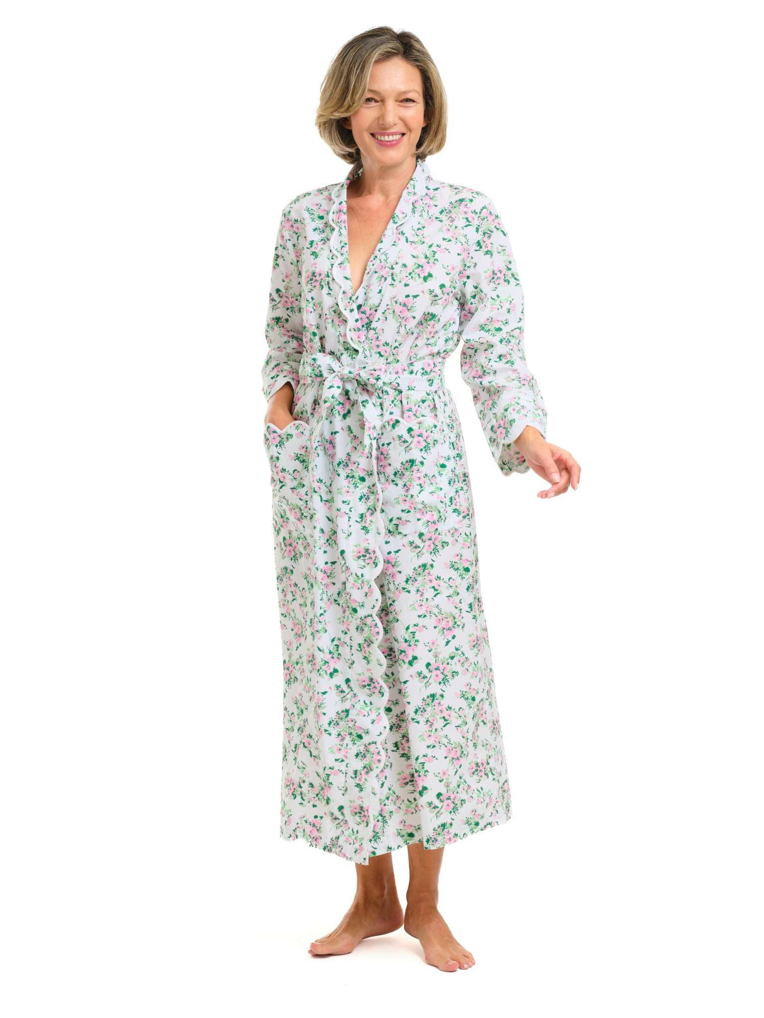 This deluxe classic 100% cotton spring floral print robe is the ultimate relaxation wear. The graceful scallop design combined with a timeless silhouette and print makes it a work of art. Designed by Heidi, this robe features an all-over hand-painted floral pattern. This classic robe has a standard fit with an attached belt. Designed to have just the right amount of fabric; not too tailored or too roomy.