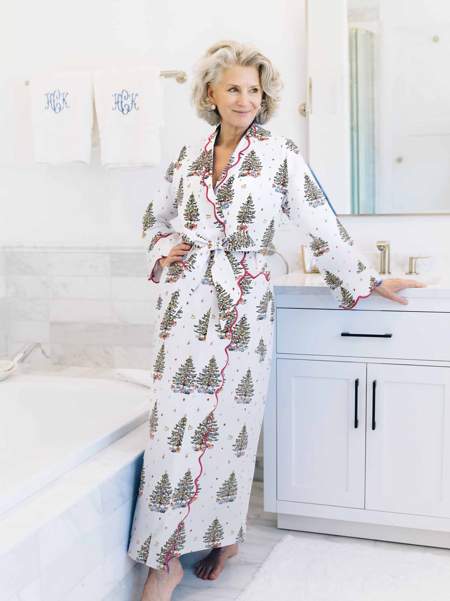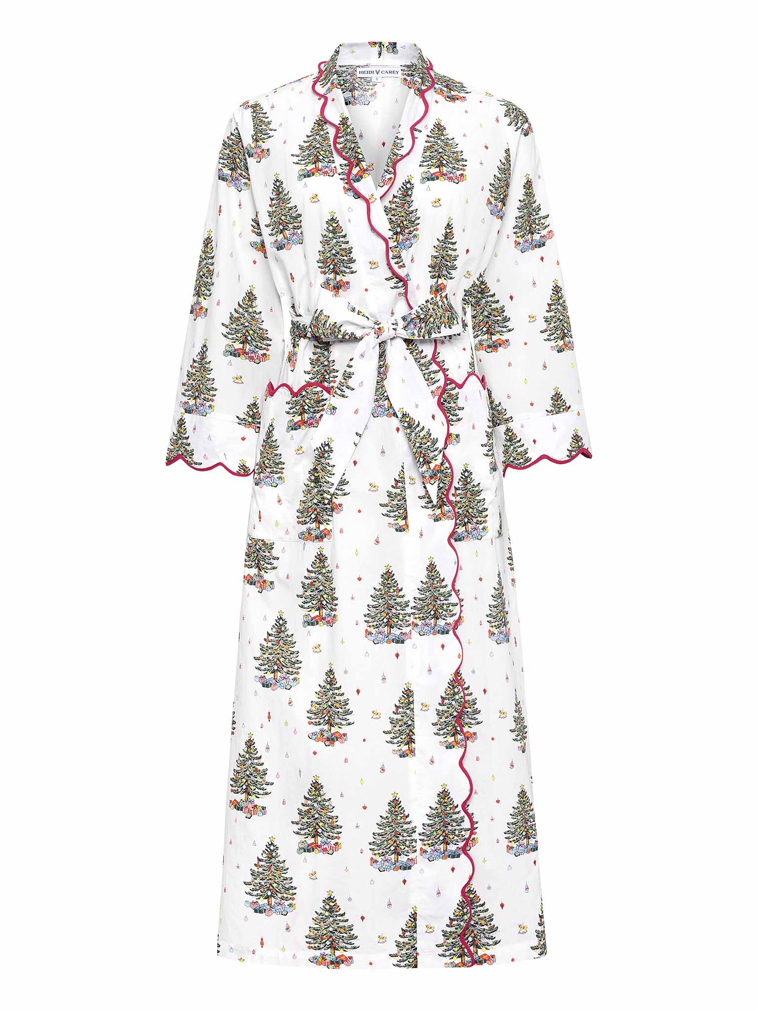 This classic Christmas Tree Holiday robe is made with 98% Indian cotton and 2% lycra for an added stretch. Crisp and durable, yet light enough for warmer temperatures. Fabric becomes softer after each wash, improving in comfort with age. Handcrafted in India by skilled artisans, each robe features exquisite hand-block printing with our new christmas tree print, an attached belt and pockets and edged with delicate scalloped trim. Our classic robe ensures you wind down the evening looking as polished as you did throughout the day.