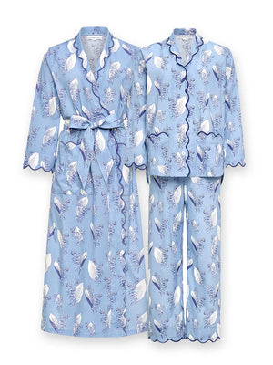 Indulge in luxurious comfort with the Blue Lily-of-the-valley Set by Heidi Carey, featuring our Classic Robe and long Pajamas. Designed by Heidi, this print features Heidi's favorite flower and our best-selling print now in a new blue colorway, making it an instant classic. This set combines elegance and coziness, perfect for relaxing at home. The graceful scallop design, combined with the timeless straight silhouette and print, makes it a work of art. This exquisite robe and pajama set adds a stylish touch to your seasonal wardrobe.