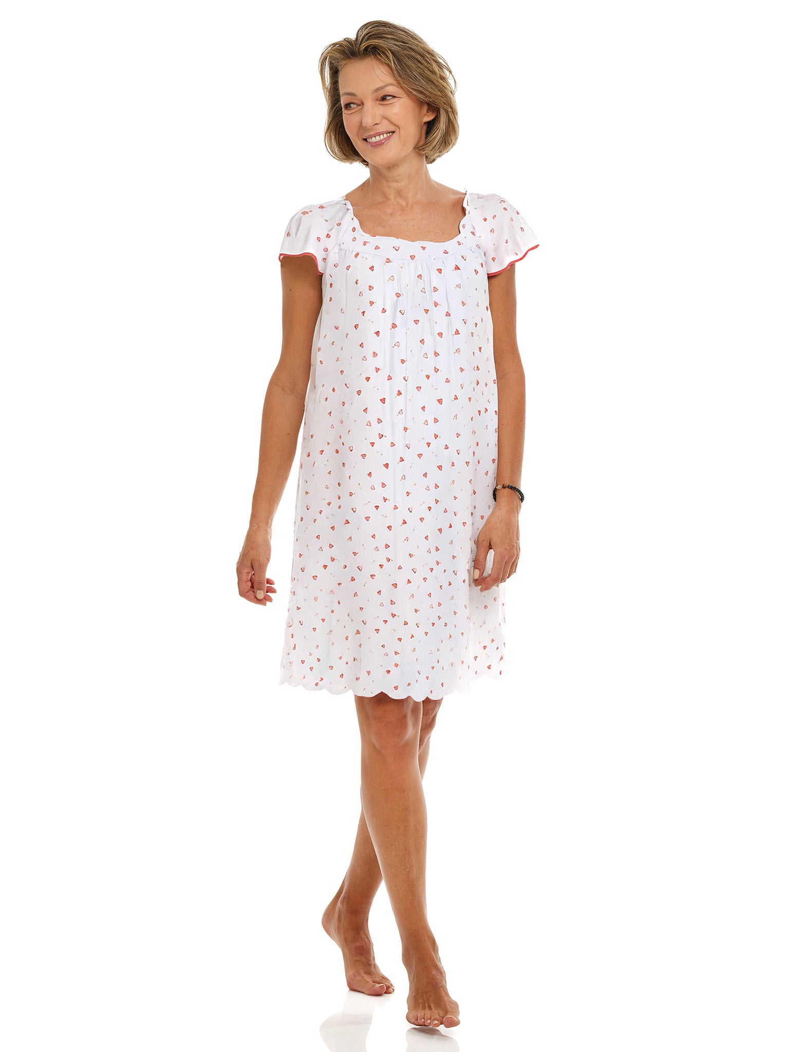 This elegant Hearts & Arrows Cap Short sleeve Nightgown is crafted from premium 100% cotton, providing treasured comfort and a luxurious feel. The subtly feminine silhouette with flowing skirt and fitted bust offers an alluring alternative to traditional shift nightgowns, while a handmade scalloped hem on the bottom and sleeves adds a sophisticated finish you won't find in everyday sleepwear. Flowing delicately with a modest, roomy fit, this exquisite nightgown adds a stylish touch to your evening spring and summer wardrobe.